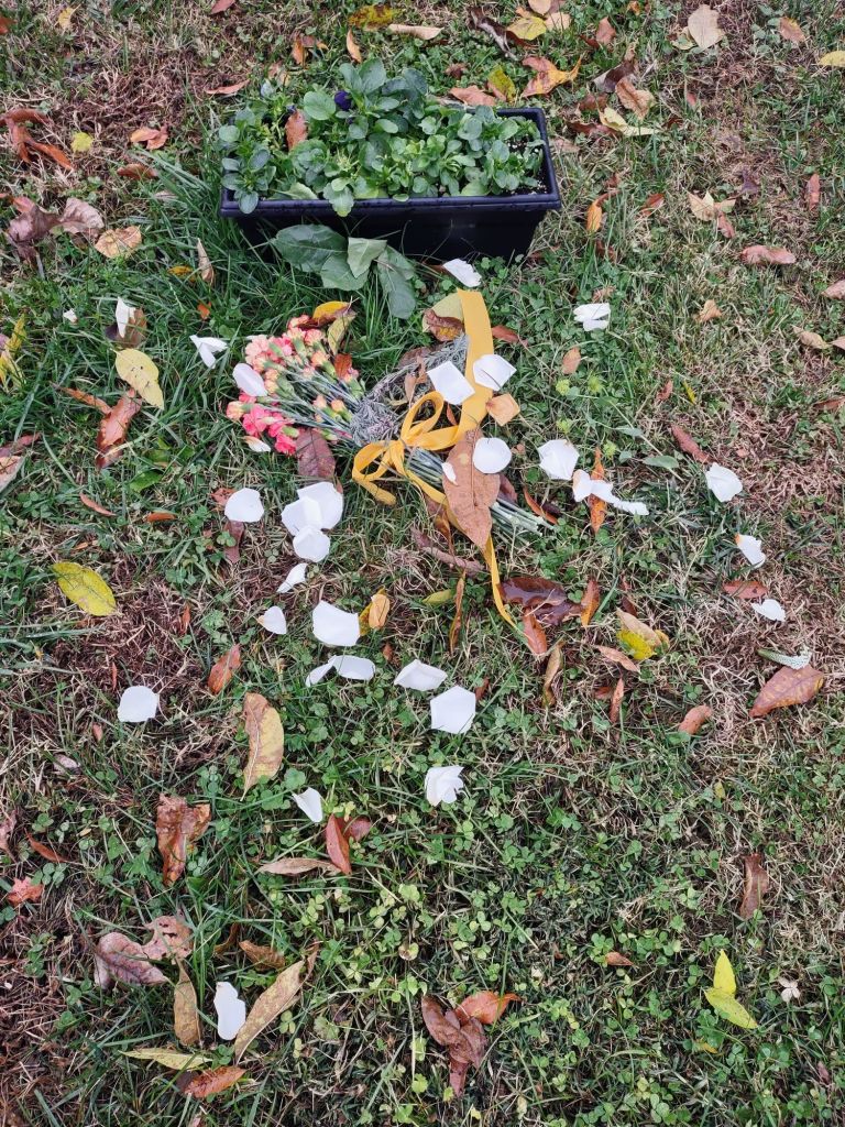 I also scattered petals on the graves from the All Saints’ Day flowers from church from last week.