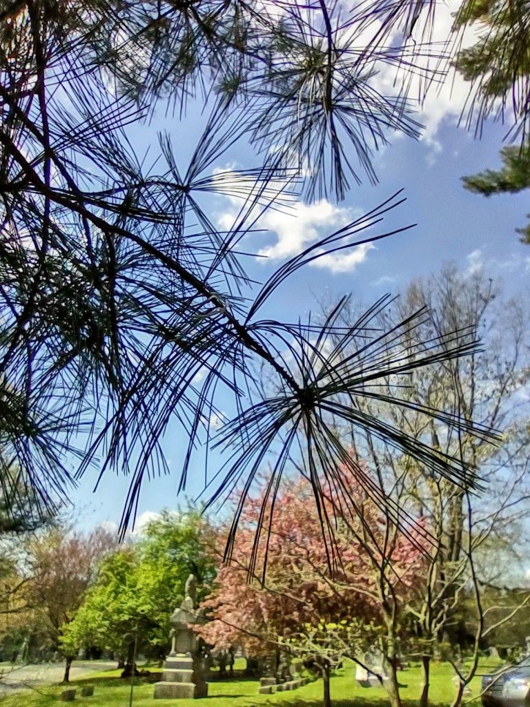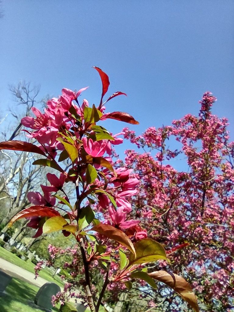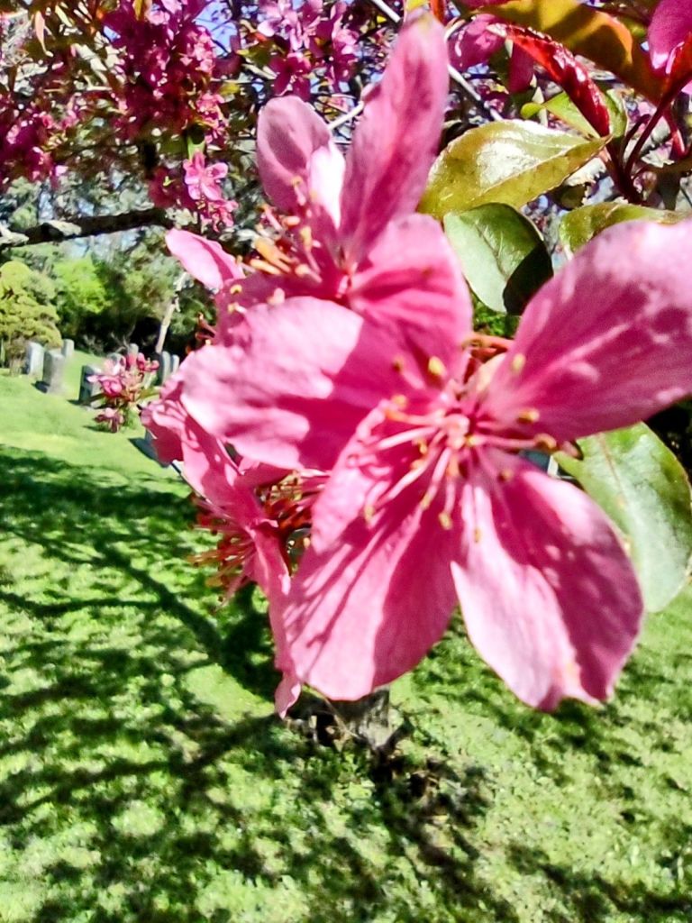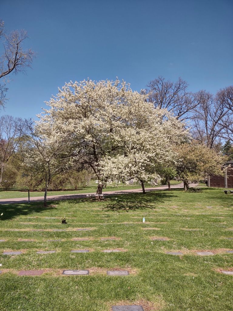 The day was a little windy, clear blue sky, a few clouds, and Spring had sprung. When we were here 20 years ago burying her, it was gray and cold and brown. No flowers yet. Today the cemetery was alive with color! Little wildflowers scattered around and forsythia was golden! And even the cherry blossoms were blooming in the palest of pink.